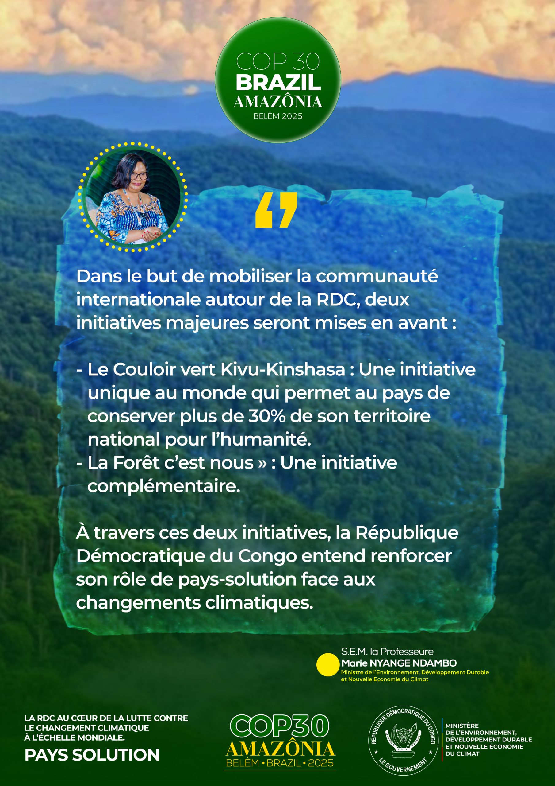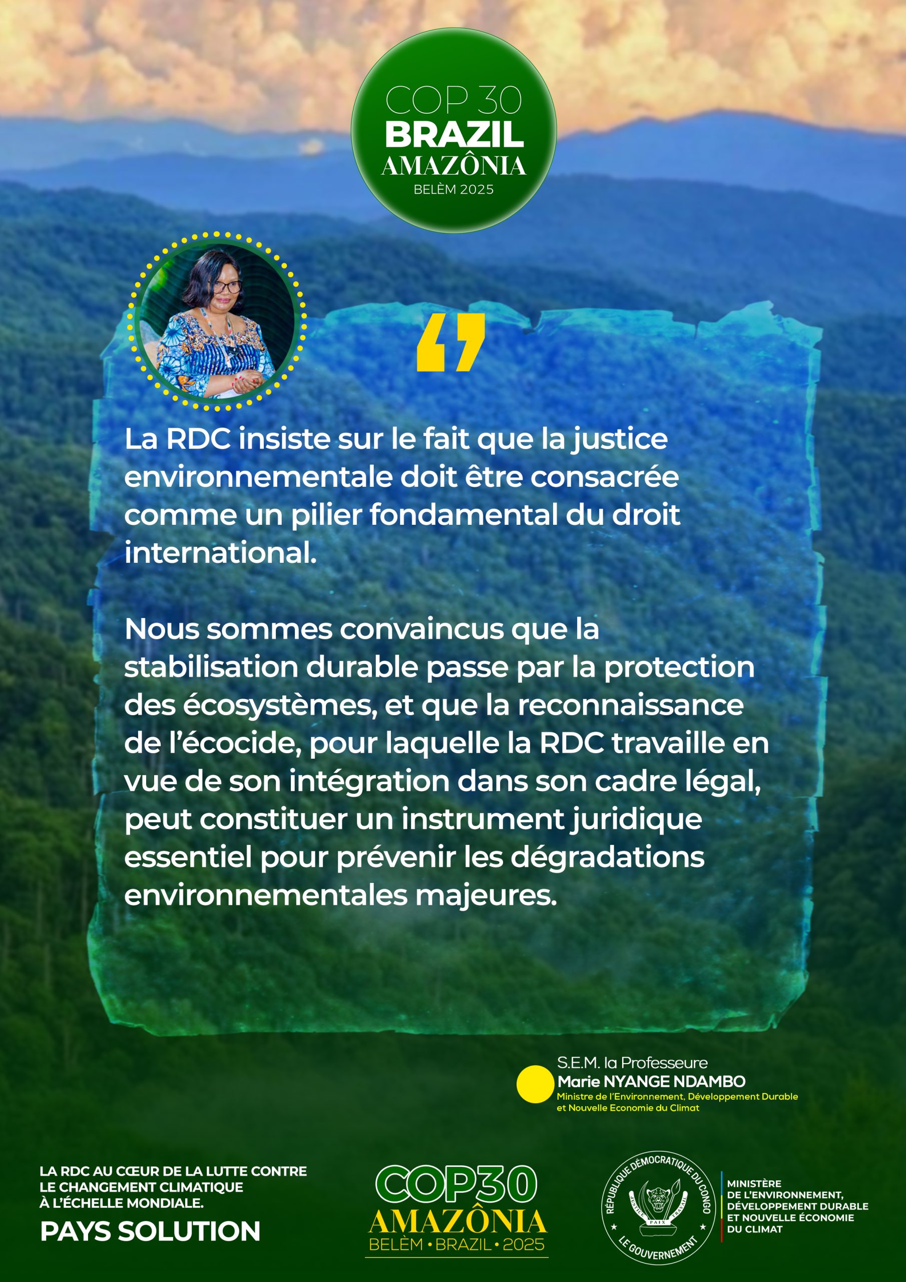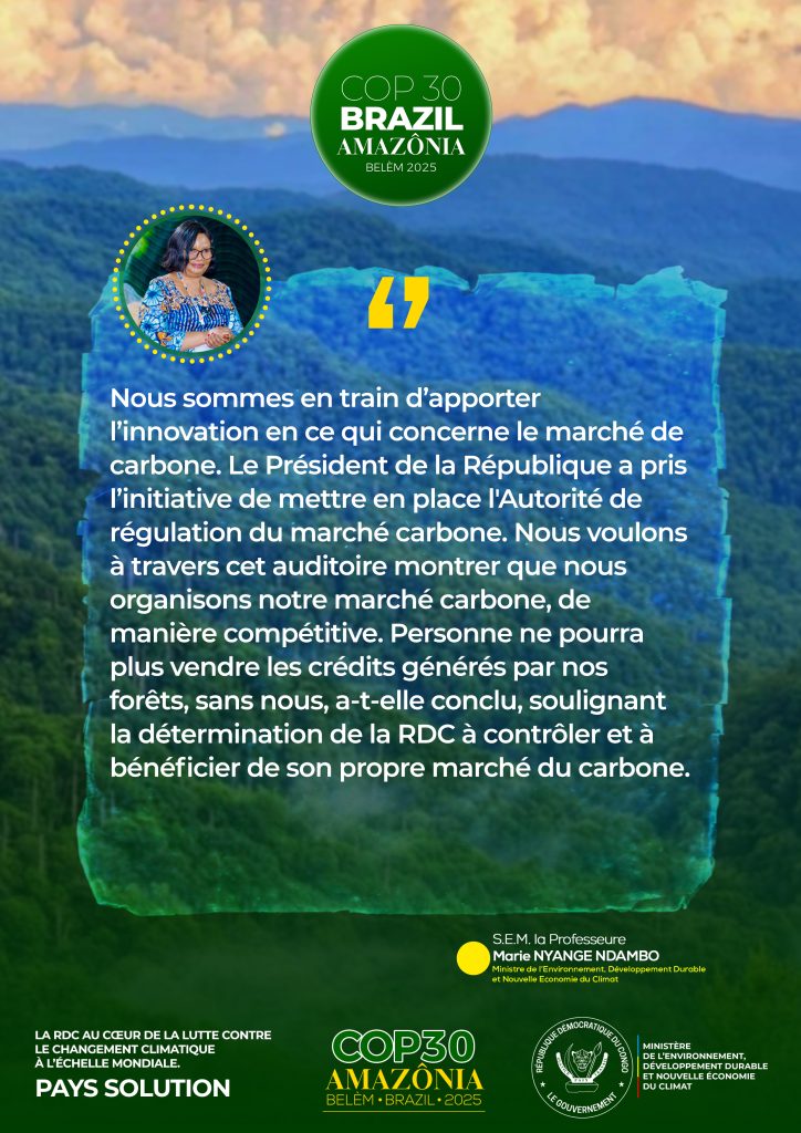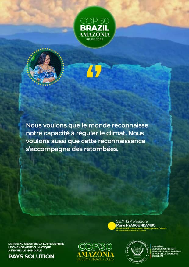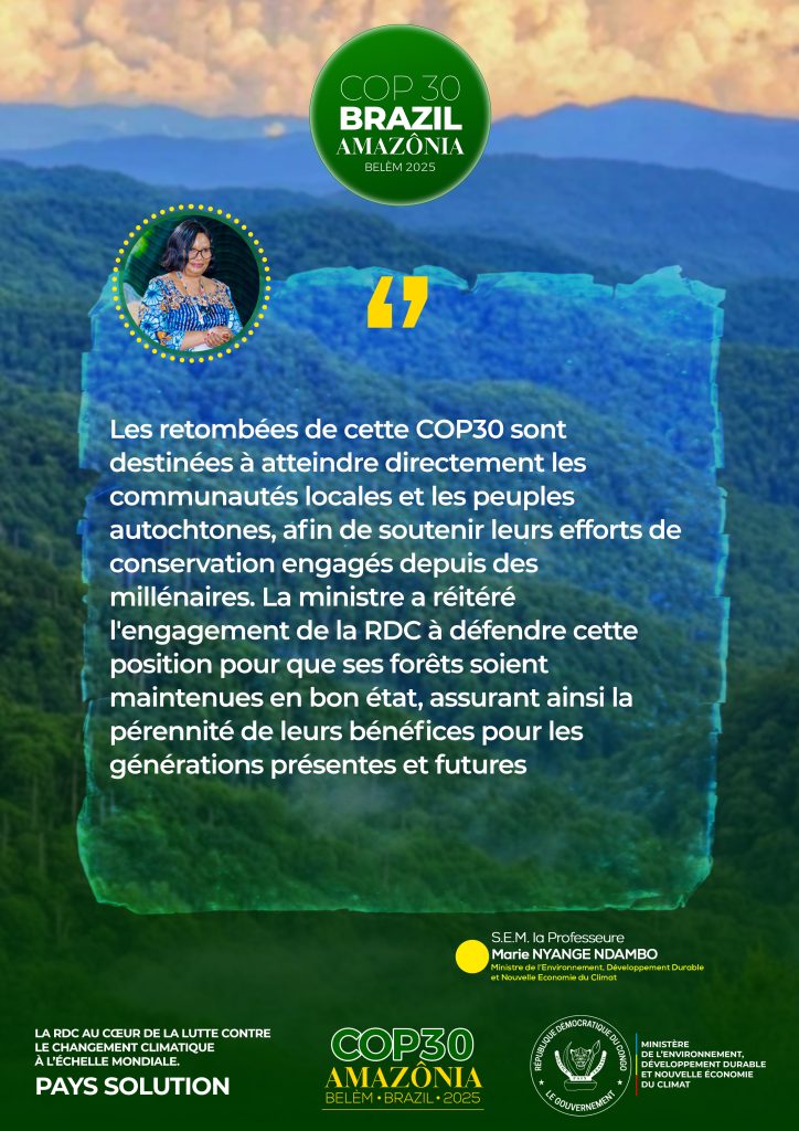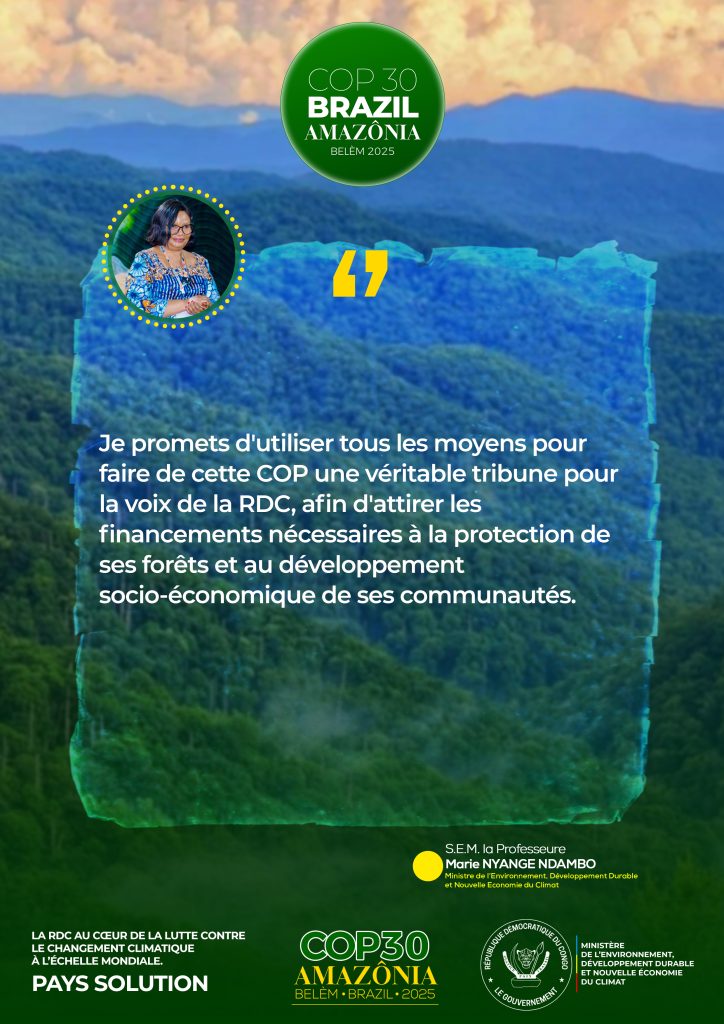 • Résumé de la participation de RDC à la COP30 à travers S.E Madame la Ministre de l’EDD-NEC, Professeure Marie Nyange Ndambo