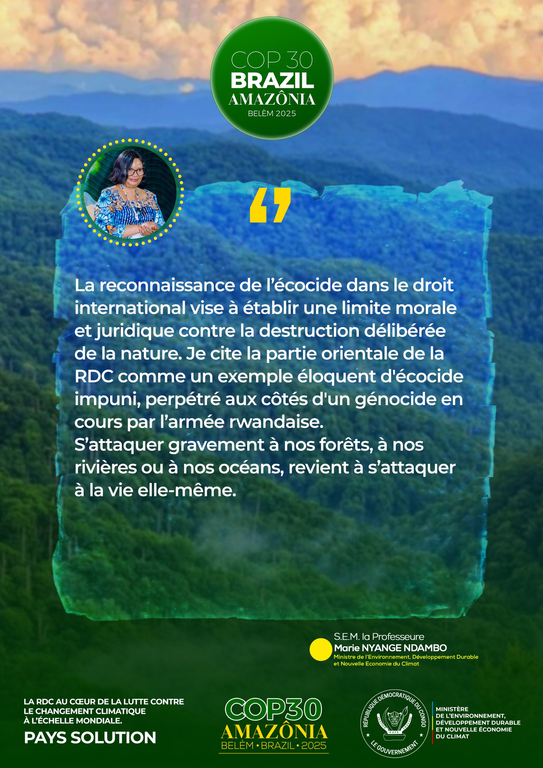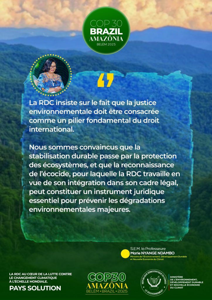 • Marie NYANGE NDAMBO insiste sur la reconnaissance de l’écocide dans le droit pénal international de la COP30